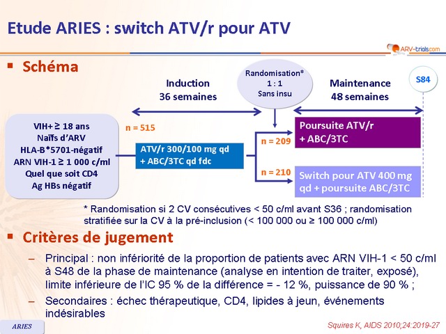 - Principal : non infériorité de la proportion de patients avec ARN VIH-1 < 50 c/ml à S48 de la phase de maintenance (analyse en intention de traiter, exposé), limite inférieure de l’IC 95 % de la différence = - 12 %, puissance de 90 % ;
