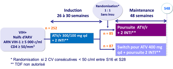 - Principal : non infériorité de la proportion de patients avec ARN VIH-1 < 50 c/ml à S48 de la phase de maintenance (analyse en intention de traiter, non compléteur = échec), limite inférieure de l’IC 95 % de la différence = - 15 %, puissance de 80 %)