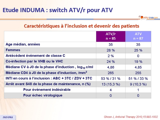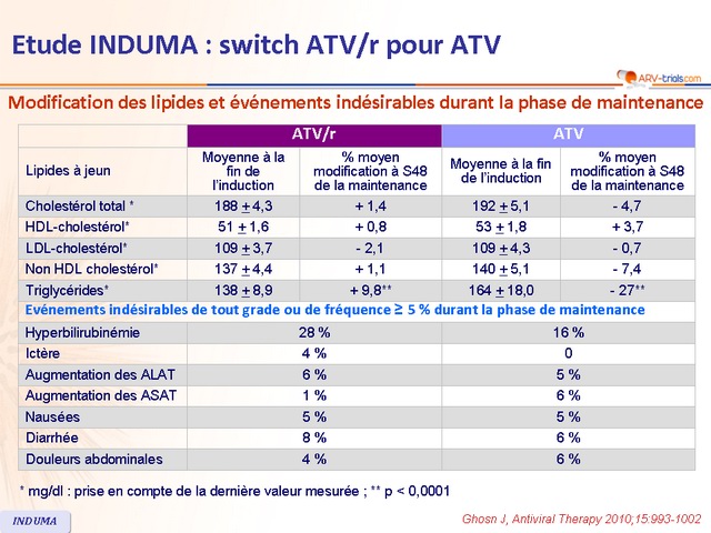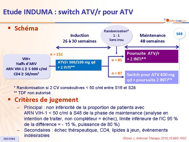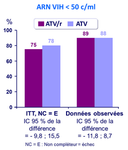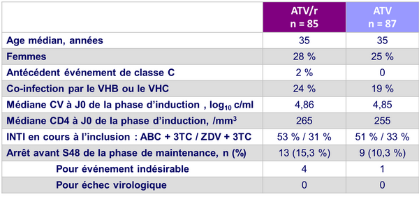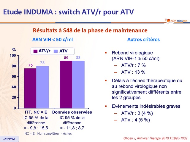 - Après induction avec ATV/r, le switch pour ATV déboosté montre une efficacité non inférieure et un meilleur profil de tolérance que la poursuite d’une trithérapie avec ATV/r sur une durée de 48 semaines