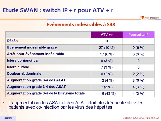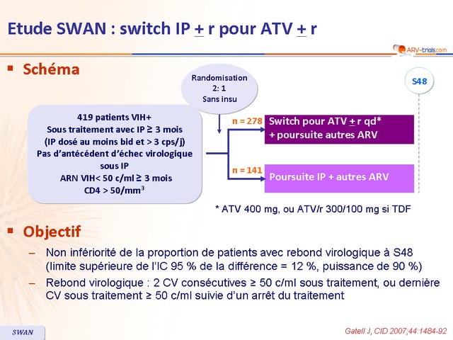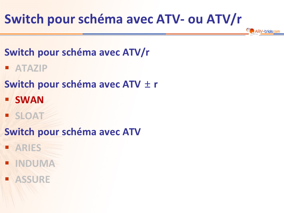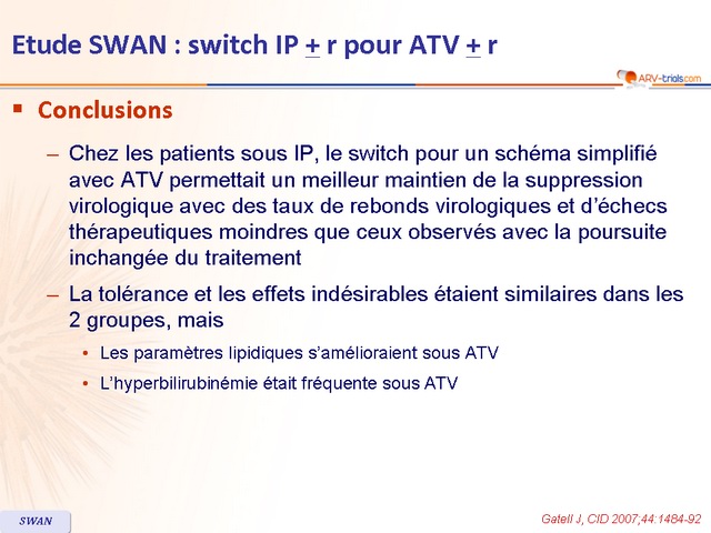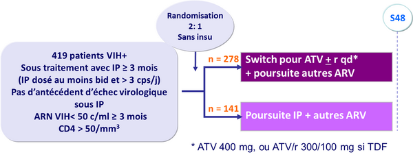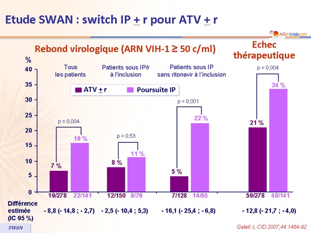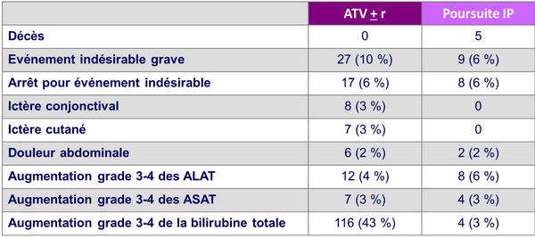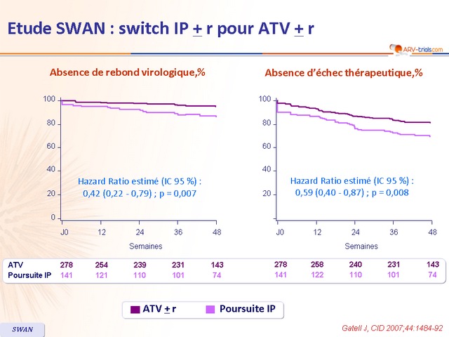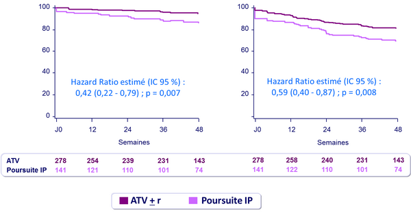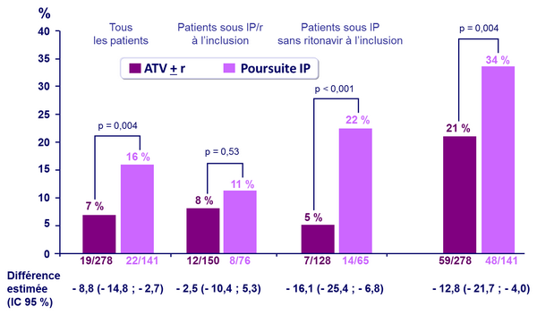 - Chez les patients sous IP, le switch pour un schéma simplifié avec ATV permettait un meilleur maintien de la suppression virologique avec des taux de rebonds virologiques et d’échecs thérapeutiques moindres que ceux observés avec la poursuite inchangée du traitement