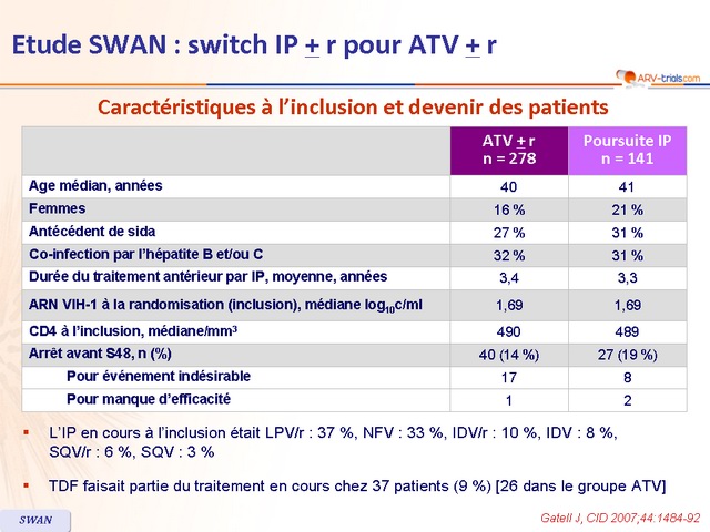 - L’IP en cours à l’inclusion était LPV/r : 37 %, NFV : 33 %, IDV/r : 10 %, IDV : 8 %, SQV/r : 6 %, SQV : 3 %