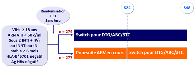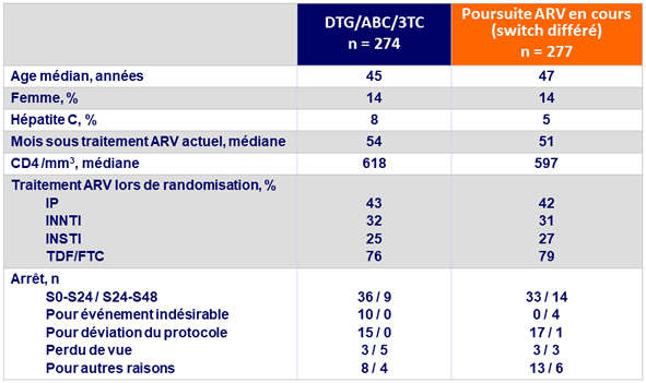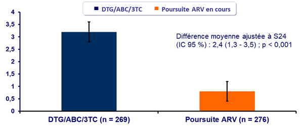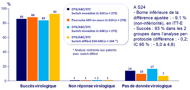 - Réponse virologique à S24 similaire pour DTG/ABC/3TC et la poursuite du traitement ARV en cours, avec non infériorité