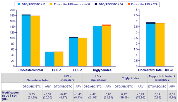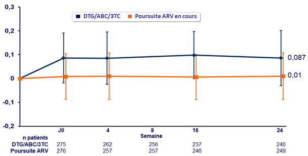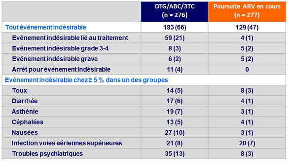 - 4 % des patients ont arrêté le traitement avant S24 pour événement indésirable dans le bras DTG/ABC/3TC vs 0 % dans le bras poursuite des ARV en cours