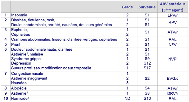 Evénements indésirables conduisant à l'arrêt de DTG/ABC/3TC (n = 10)