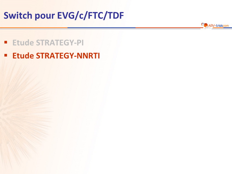 - EVG/c/FTC/TDF est une option de switch chez les patients avec suppression virologique sous un schéma avec INNTI, sans antécédent d'échec virologique, lorsque la poursuite de schéma n'est pas souhaité