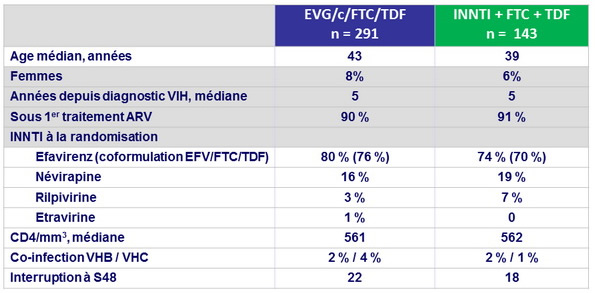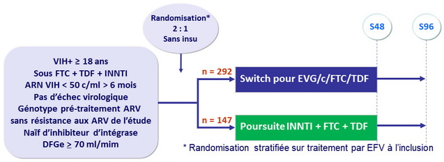 - Secondaires : proportion de patients maintenant ARN VIH < 50 c/ml à S48 (algorithme TLOVR), CD4, tolérance, effets indésirables