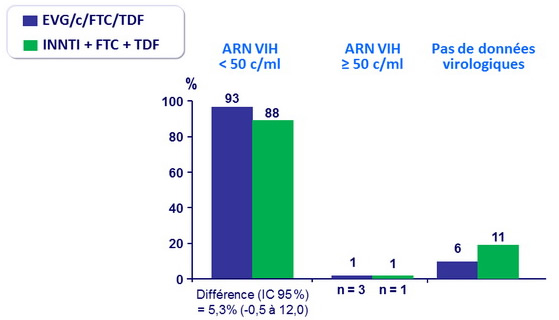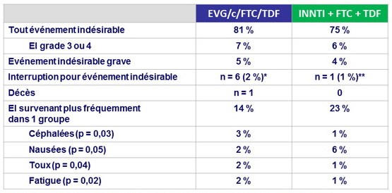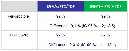 - EVG/c/FTC/TDF est non inférieur à la poursuite d'un traitement en cours comportant INNTI + FTC et TDF chez des patients VIH adultes, avec suppression virologique et absence d'antécédent d'échec virologique