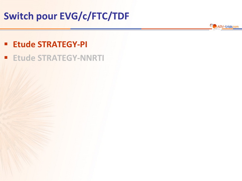 - EVG/c/FTC/TDF est une option de switch chez les patients avec suppression virologique et sans antécédent d'échec virologique qui souhaitent simplifier leur schéma avec IP/r, ou qui ont des inquiétudes sur les possibles événements indésirables ou effets secondaires à long-terme de leur traitement actuel