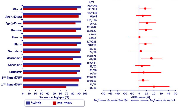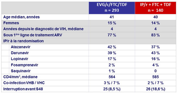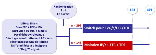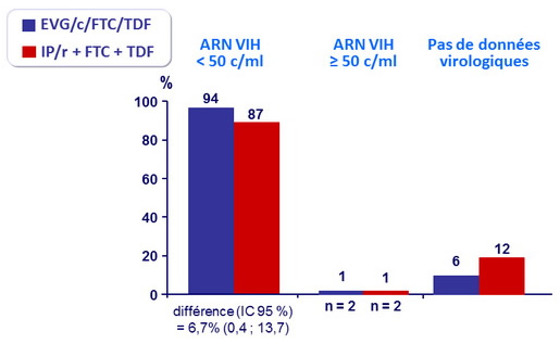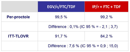- Secondaires : proportion de patients maintenant ARN VIH < 50 c/ml à S48 (algorithme TLOVR), CD4, tolérance, effets indésirables
