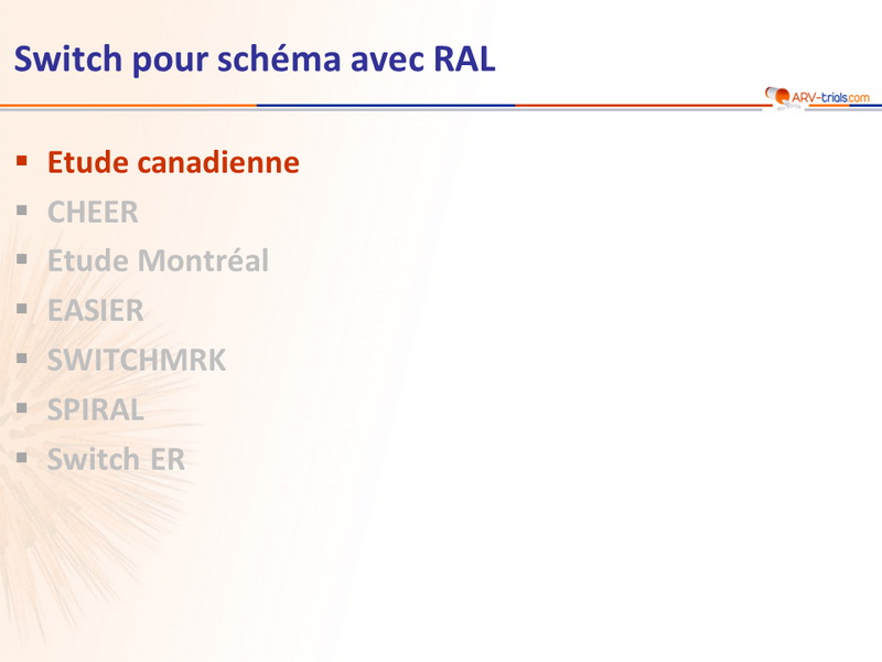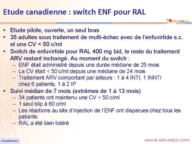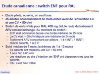 - Switch de enfuvirtide pour RAL 400 mg bid, le reste du traitement ARV restant inchangé. Au moment du switch :