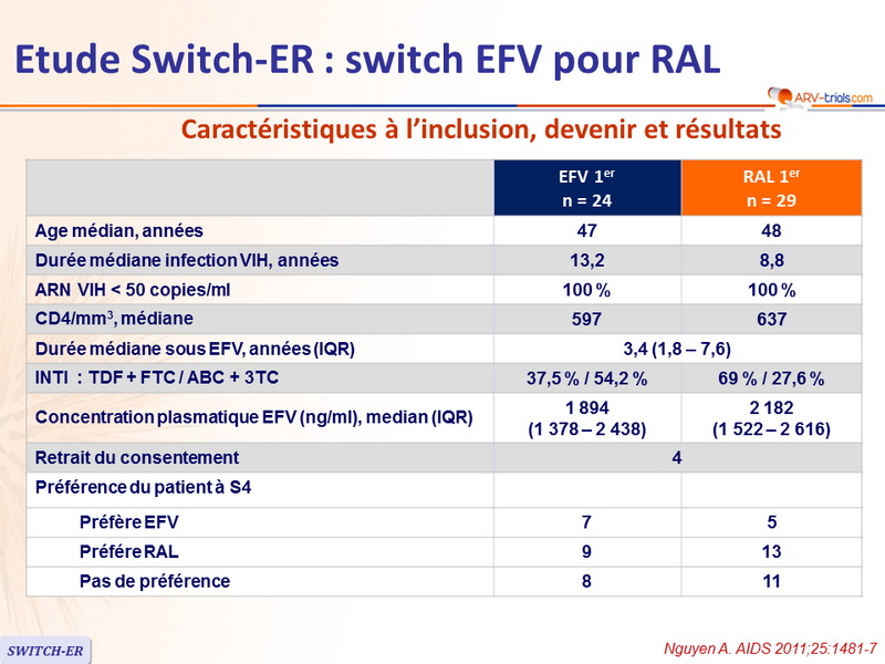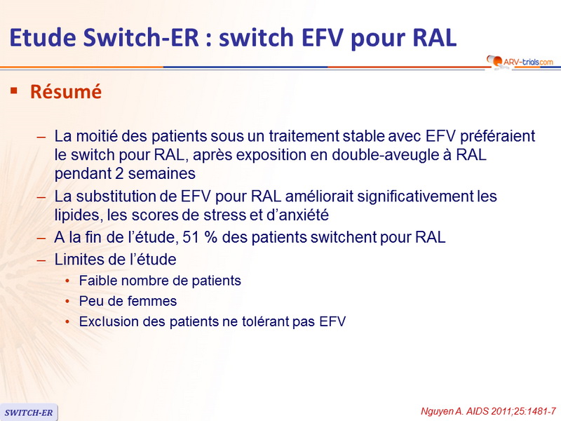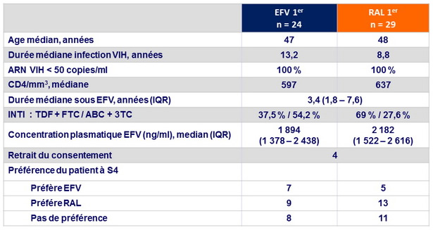 - La moitié des patients sous un traitement stable avec EFV préféraient le switch pour RAL, après exposition en double-aveugle à RAL pendant 2 semaines