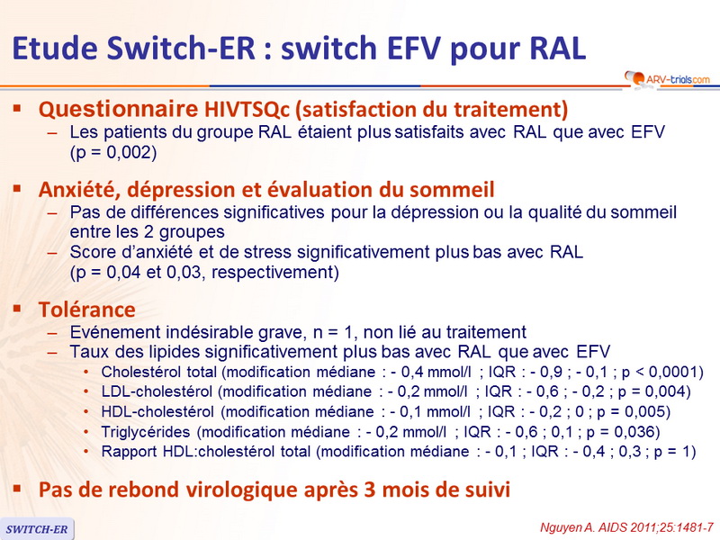 - La substitution de EFV pour RAL améliorait significativement les lipides, les scores de stress et d'anxiété