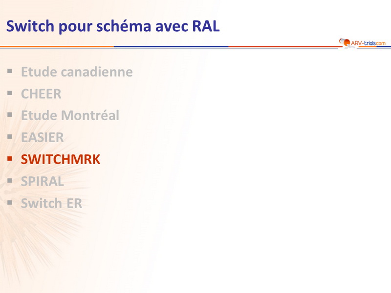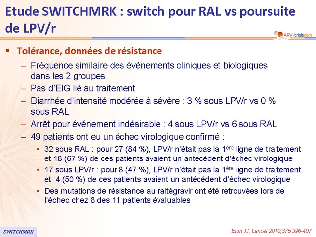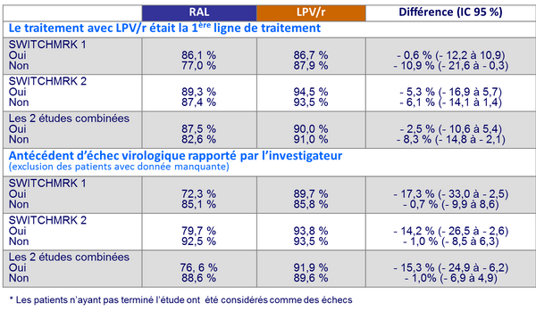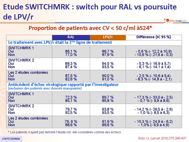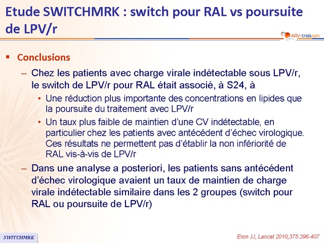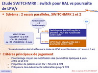 - Dans une analyse a posteriori, les patients sans antécédent d’échec virologique avaient un taux de maintien de charge virale indétectable similaire dans les 2 groupes (switch pour RAL ou poursuite de LPV/r)