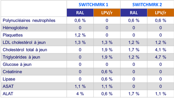 - Arrêt pour événement indésirable : 4 sous LPV/r vs 6 sous RAL