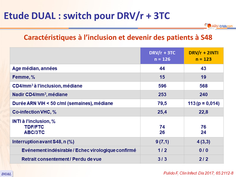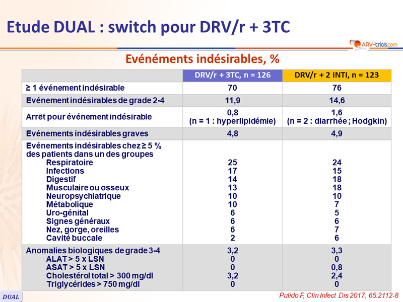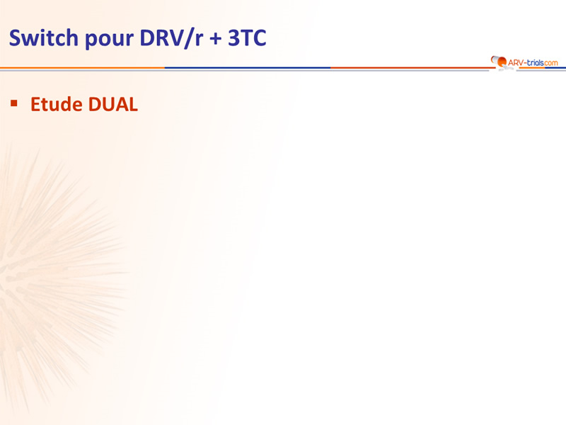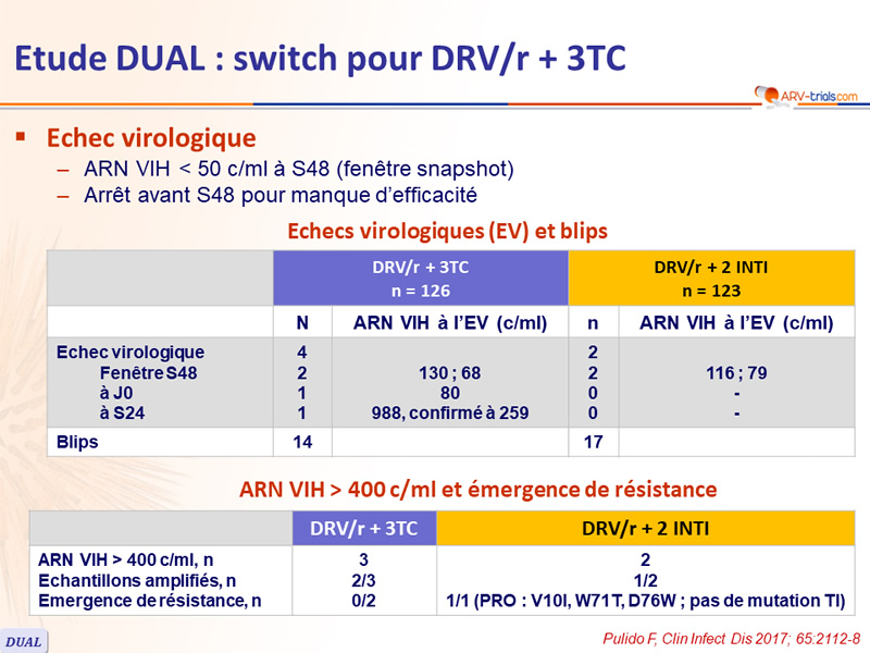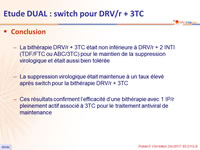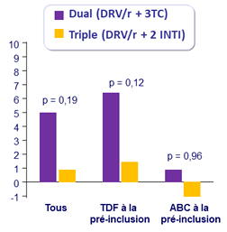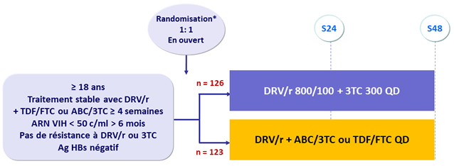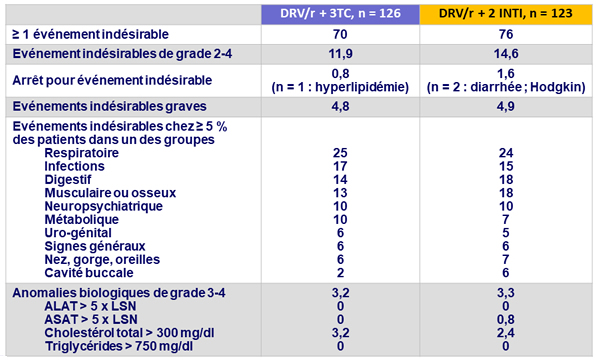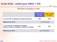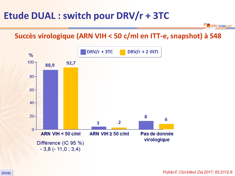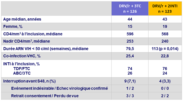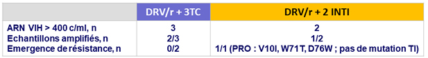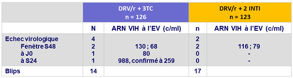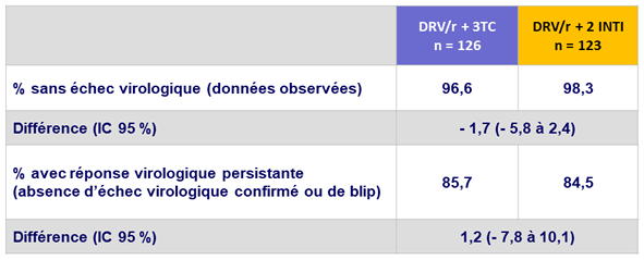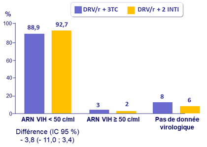 - Non infériorité de DRV/r + 3TC à S48 : pourcentage ARN VIH < 50 c/ml en ITTe , snapshot (borne inférieure de l'IC 95 % de la différence = - 12 %, puissance de 80 %)