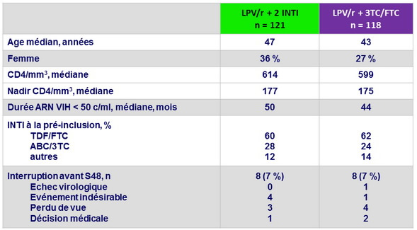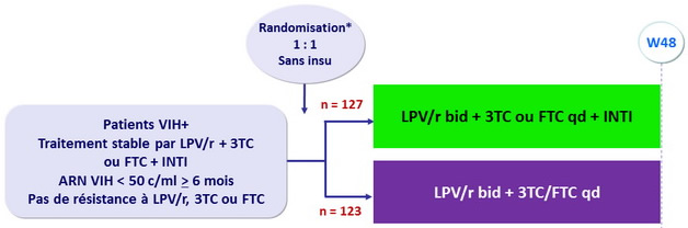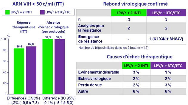 - Chez les patients contrôlés virologiquement sous trithérapie par LPV/r + 2 INTI, le switch pour LPV/r + 3TC ou FTC a montré une efficacité virologique non inférieure et une tolérance similaire au maintien de LPV/r + 2 INTI