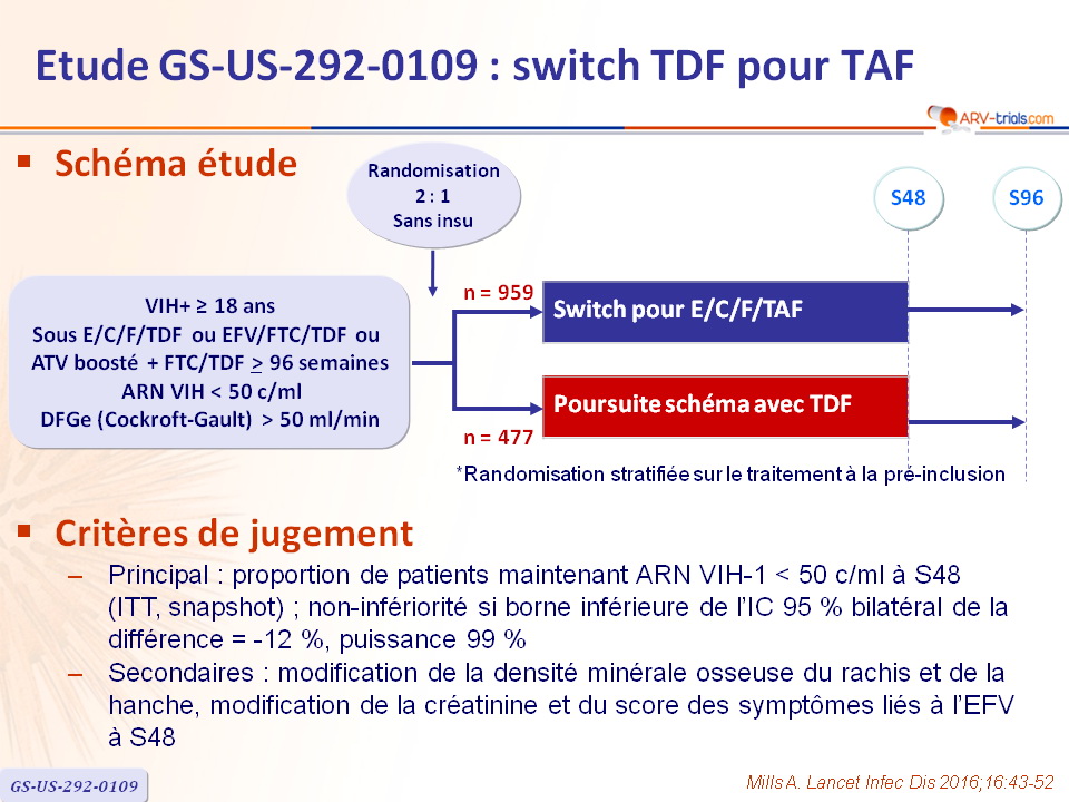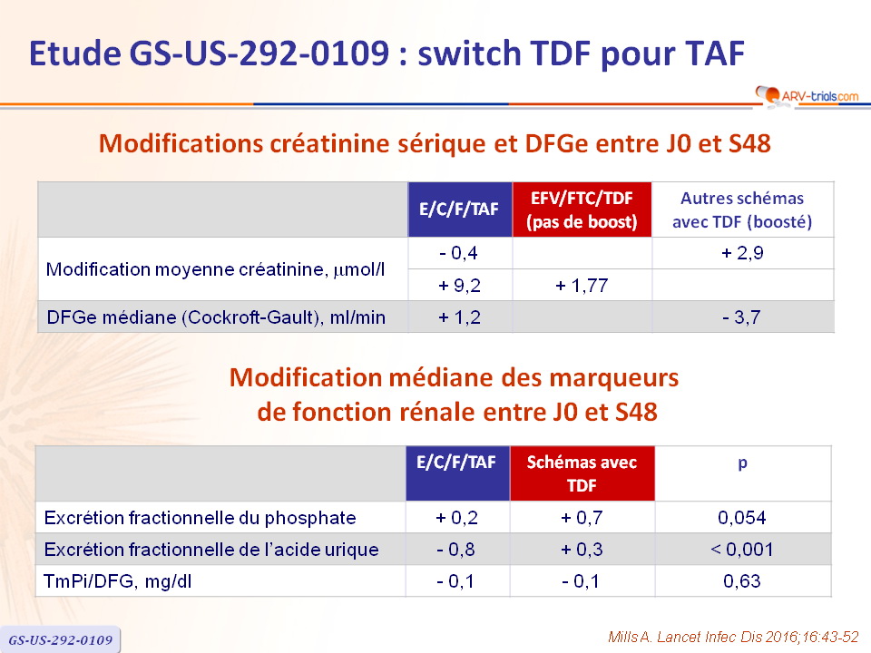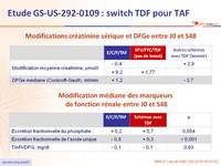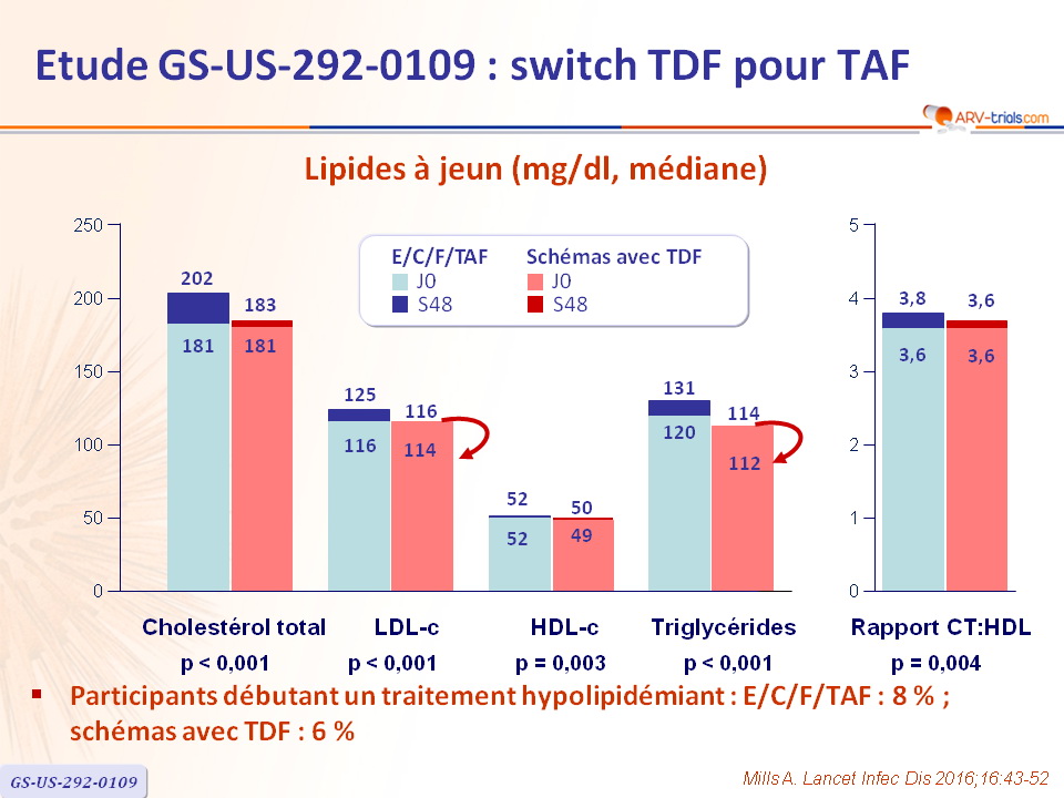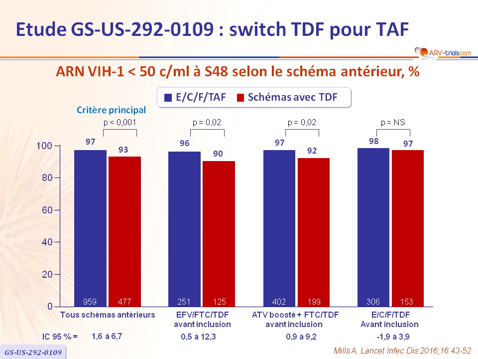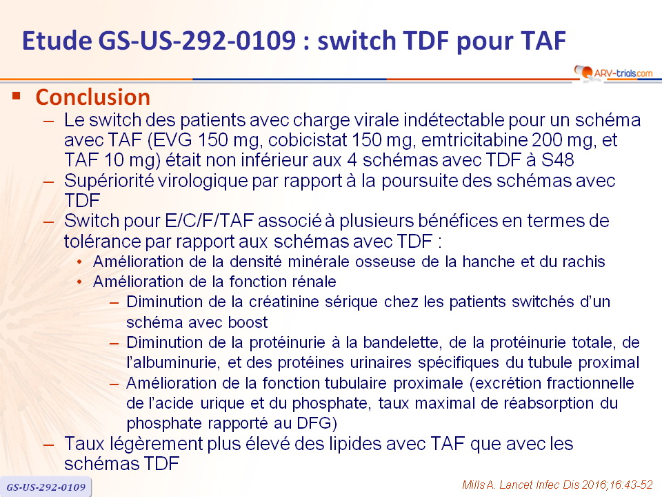 * 1 patient dans le groupe TAF avec échec virologique (S8) a développé une résistance au génotype : M184I/M.