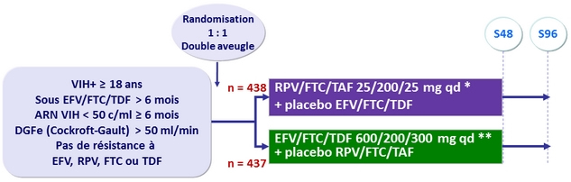 - Principal : pourcentage de patients conservant un taux d'ARN VIH < 50 c/ml à S48 (ITT, snapshot) ; non infériorité avec une limite de l'IC 95,001 % bilatéral de la différence = - 8 %, puissance de 95 %