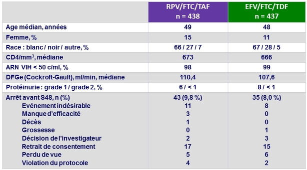 - Globalement, chez les patients infectés par le VIH et contrôlés virologiquement, le switch pour rilpivirine, emtricitabine, et tenofovir alafenamide a permis de maintenir une charge virale indétectable à S48 de manière identique à la poursuite de la trithérapie avec efavirenz, emtricitabine, et tenofovir disoproxil fumarate
