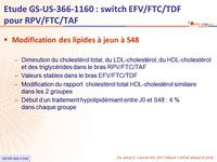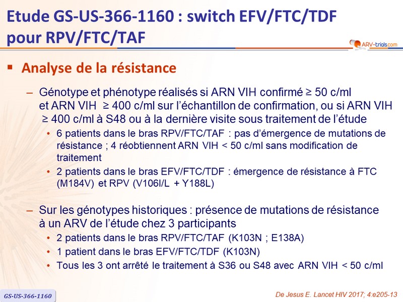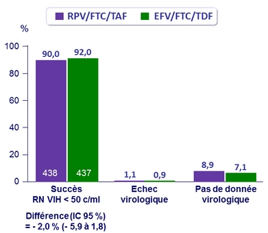 - 6 patients dans le bras RPV/FTC/TAF : pas d'émergence de mutations de résistance ; 4 réobtiennent ARN VIH < 50 c/ml sans modification de traitement