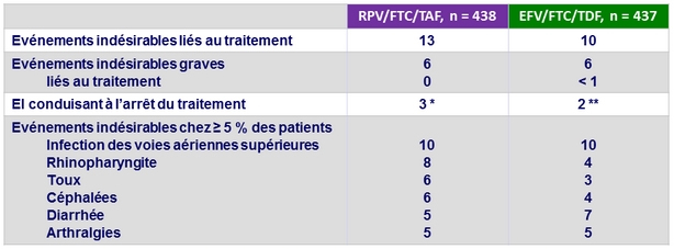 - 1 patient a arrêté le traitement pour baisse du DFGe (de 54,2 à 26,4 ml/min) dans le bras RPV/FTC/TAF