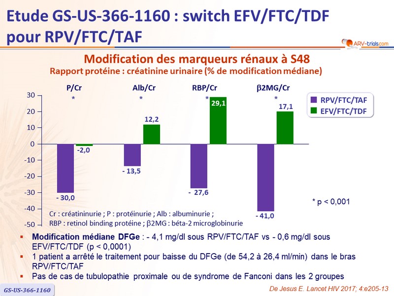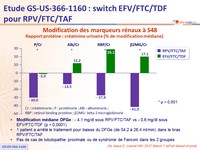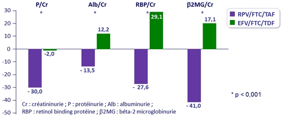- Modification médiane DFGe : - 4,1 mg/dl sous RPV/FTC/TAF vs - 0,6 mg/dl sous EFV/FTC/TDF (p < 0,0001)