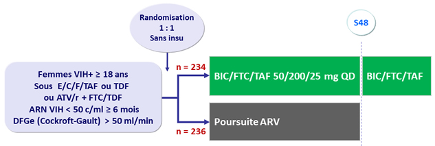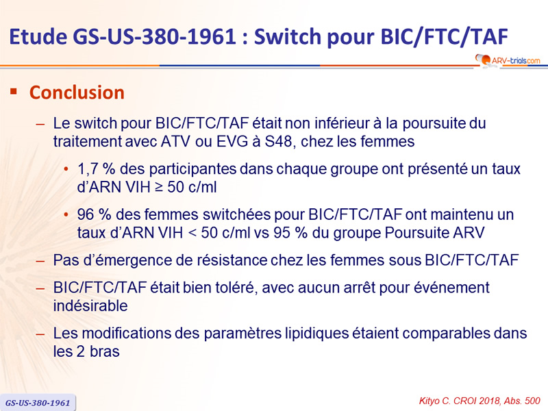 - Le switch pour BIC/FTC/TAF était non inférieur à la poursuite du traitement avec ATV ou EVG à S48, chez les femmes