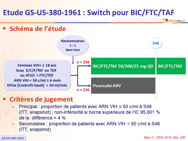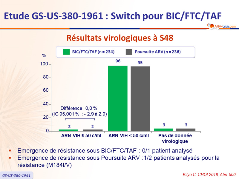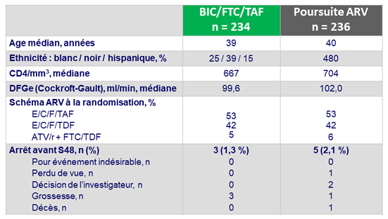 - Principal : proportion de patients avec ARN VIH ≥ 50 c/ml à S48 (ITT, snapshot) ; non-infériorité si borne supérieure de l'IC 95,001 %