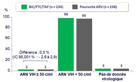 - 96 % des femmes switchées pour BIC/FTC/TAF ont maintenu un taux d'ARN VIH < 50 c/ml vs 95 % du groupe Poursuite ARV